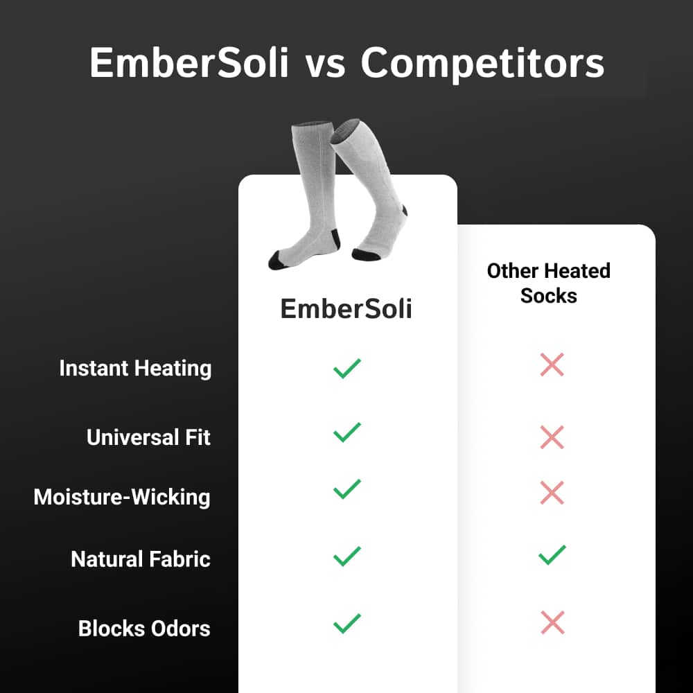 EmberSoli Heated Socks use premium Modal cotton for superior softness and breathability. The multi-layer construction includes windproof, insulation, heating, and comfort layers for maximum warmth and moisture-wicking performance.