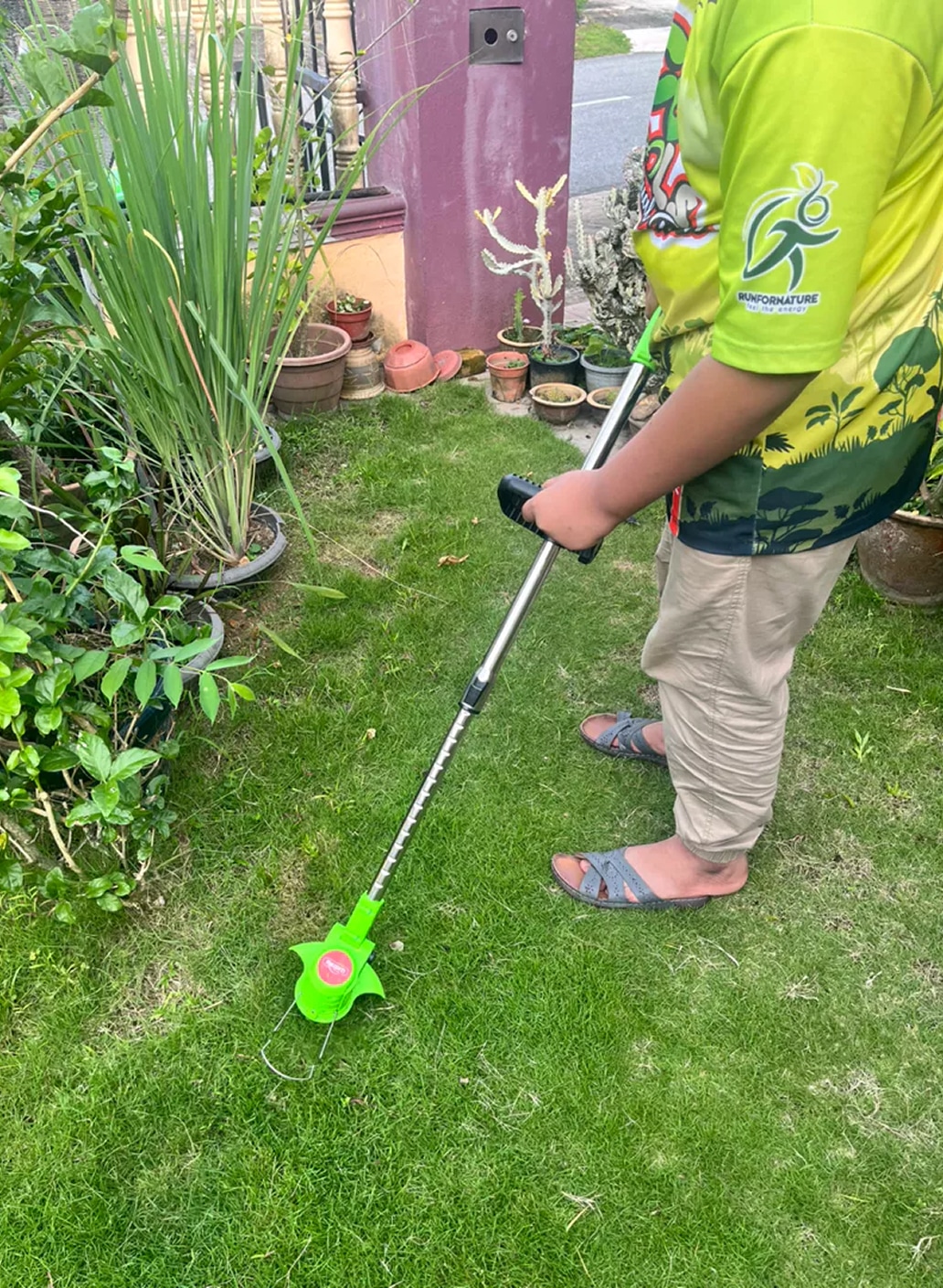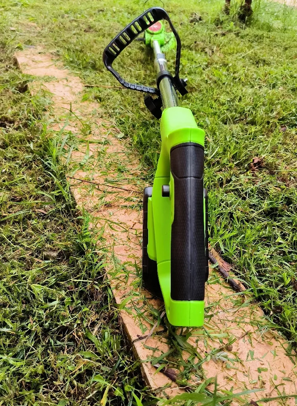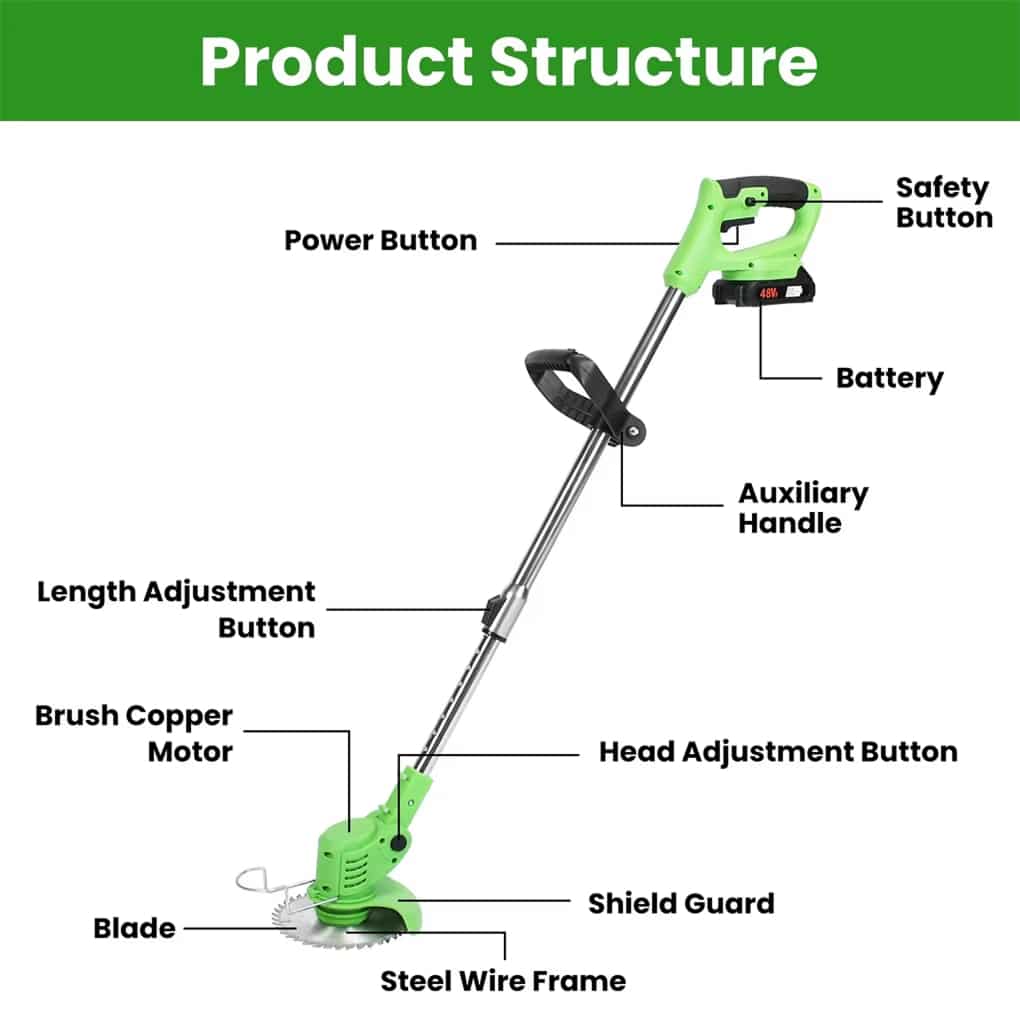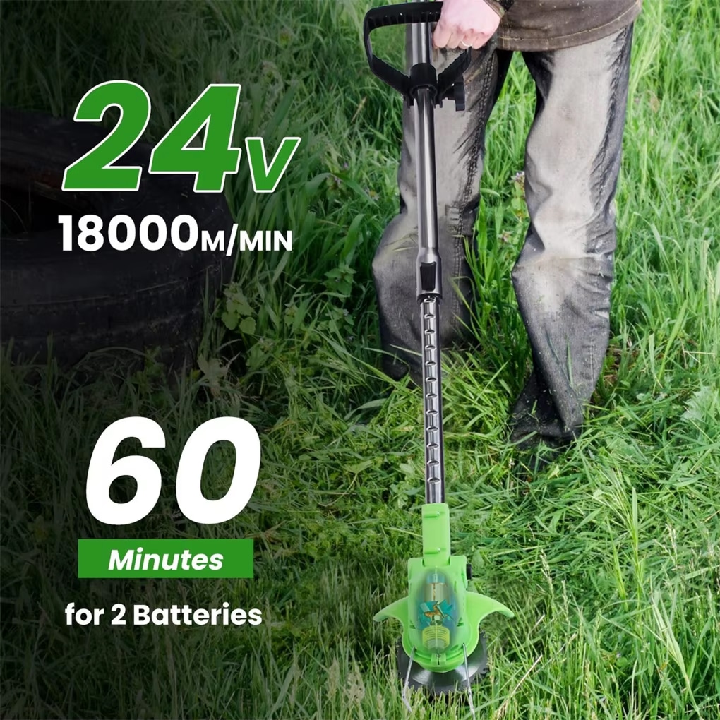 Battery life varies by usage intensity, typically providing 30-45 minutes of continuous operation for most residential trimming tasks.