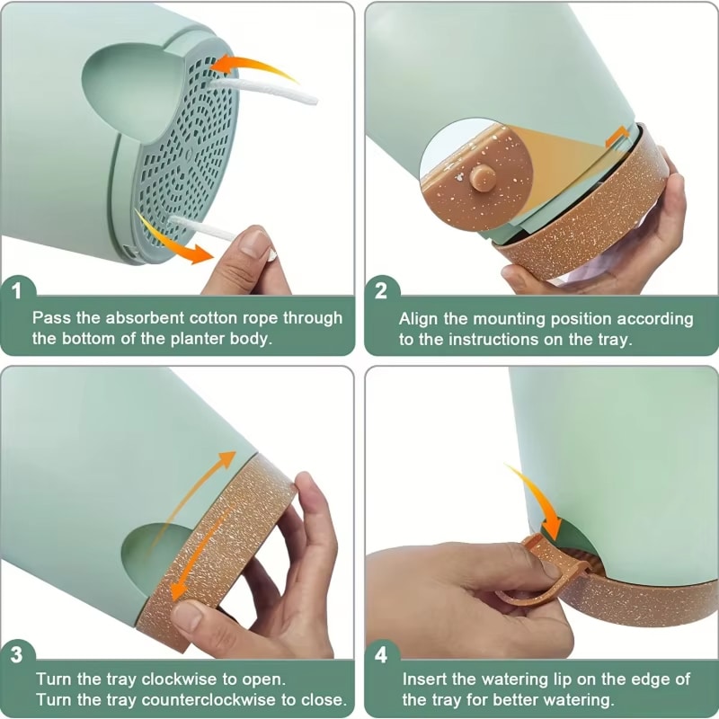The absorbent cotton rope draws water from the bottom reservoir upward into the soil through capillary action, delivering consistent moisture as the plant needs it throughout the week.
