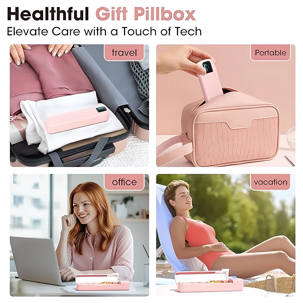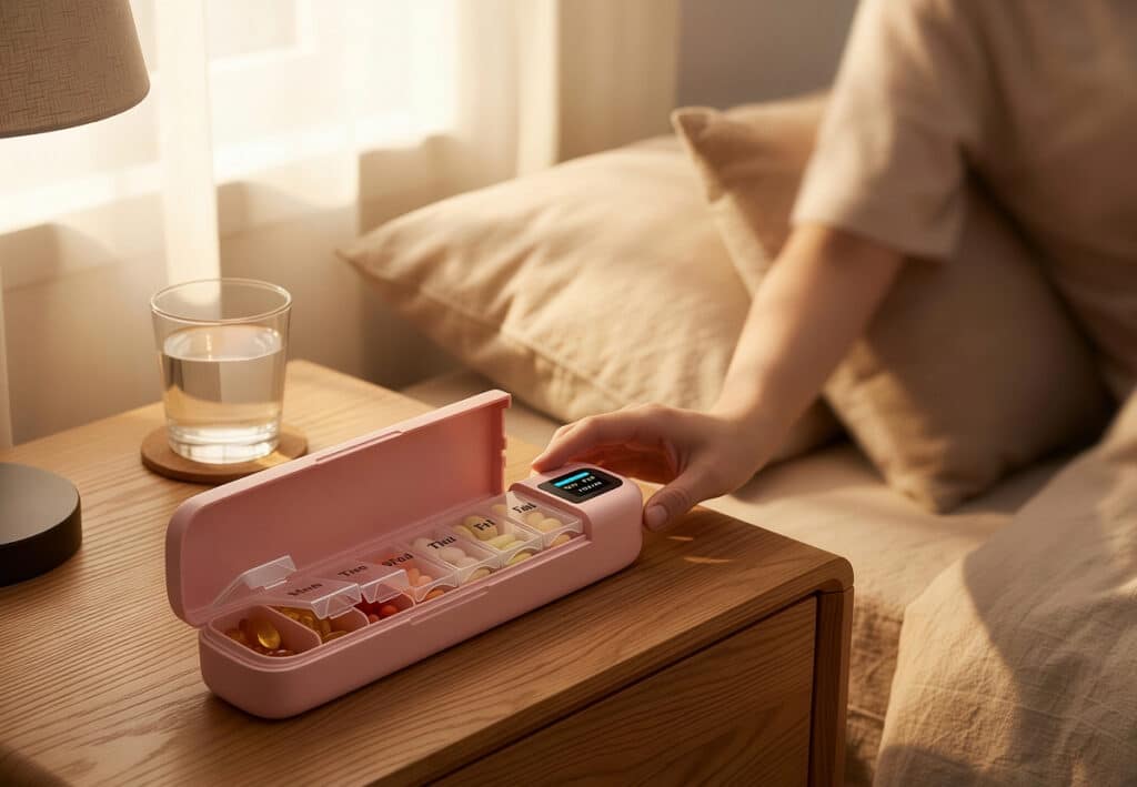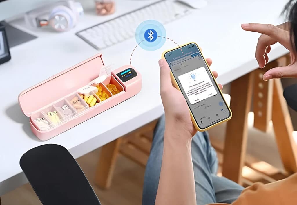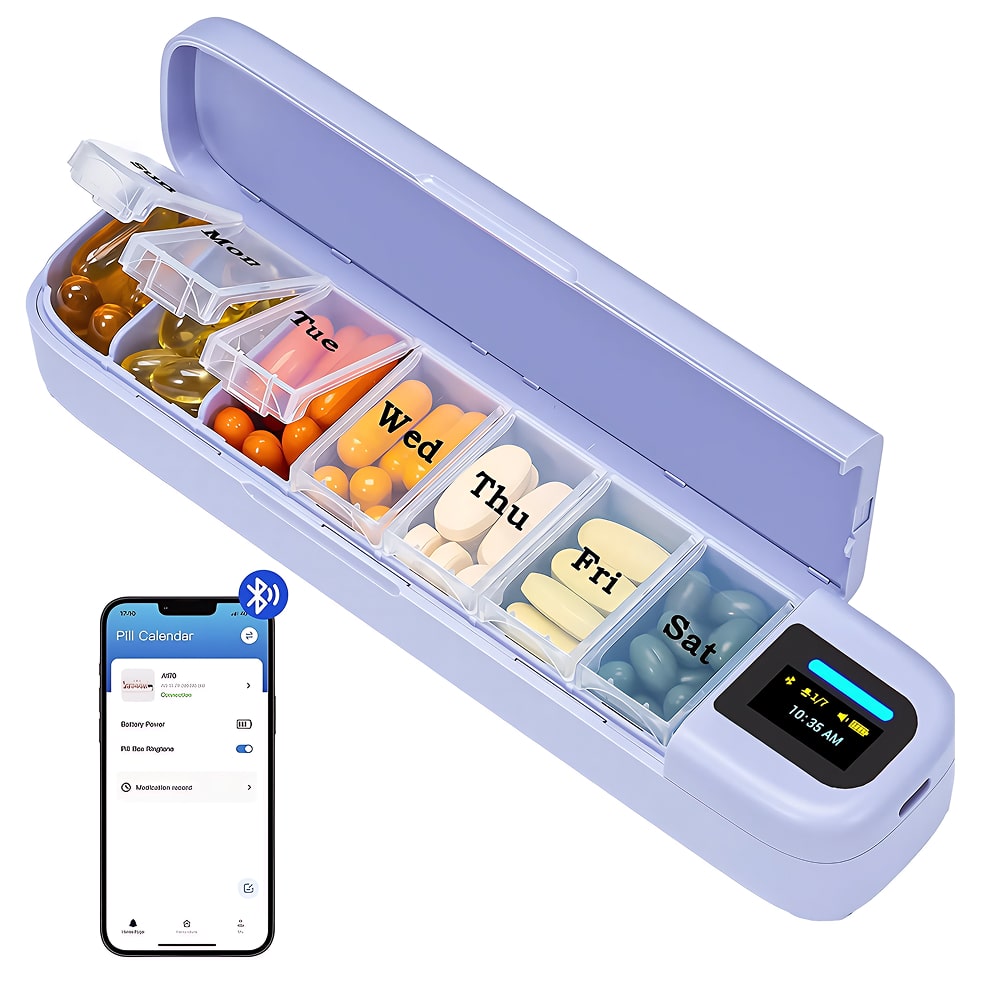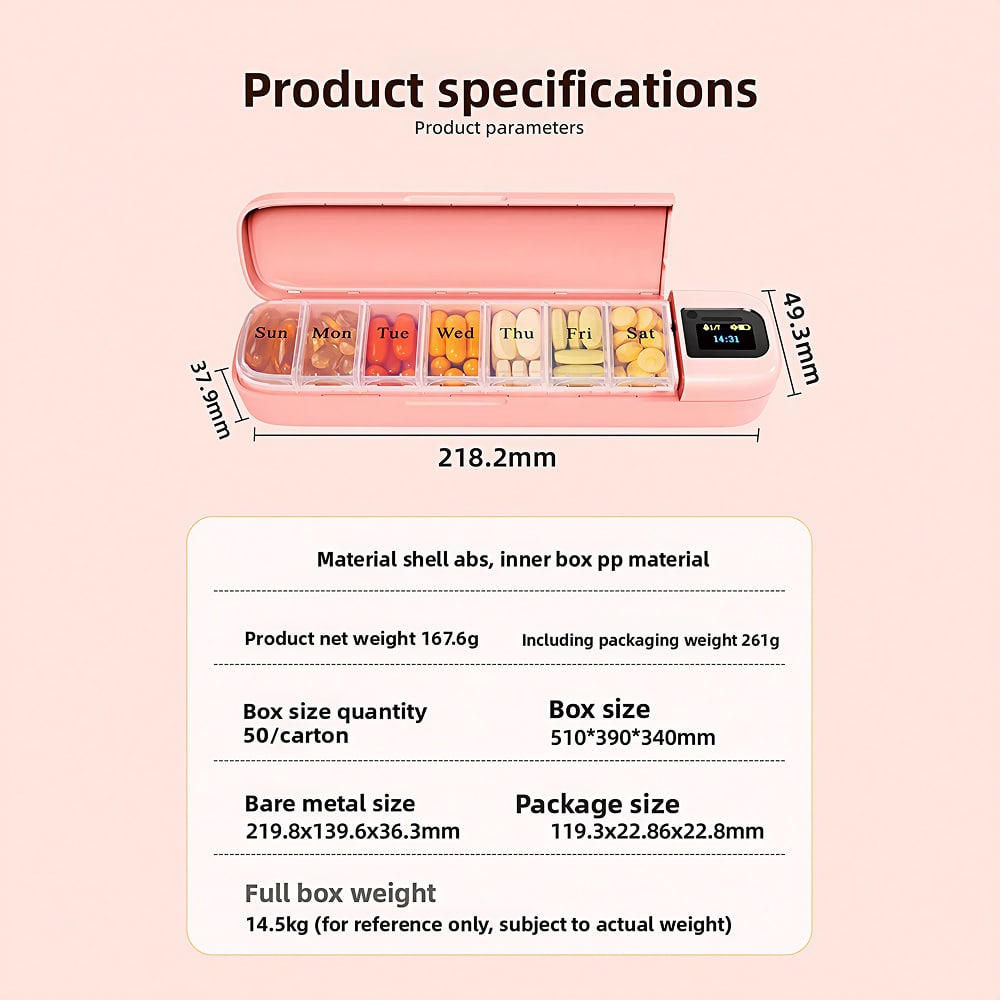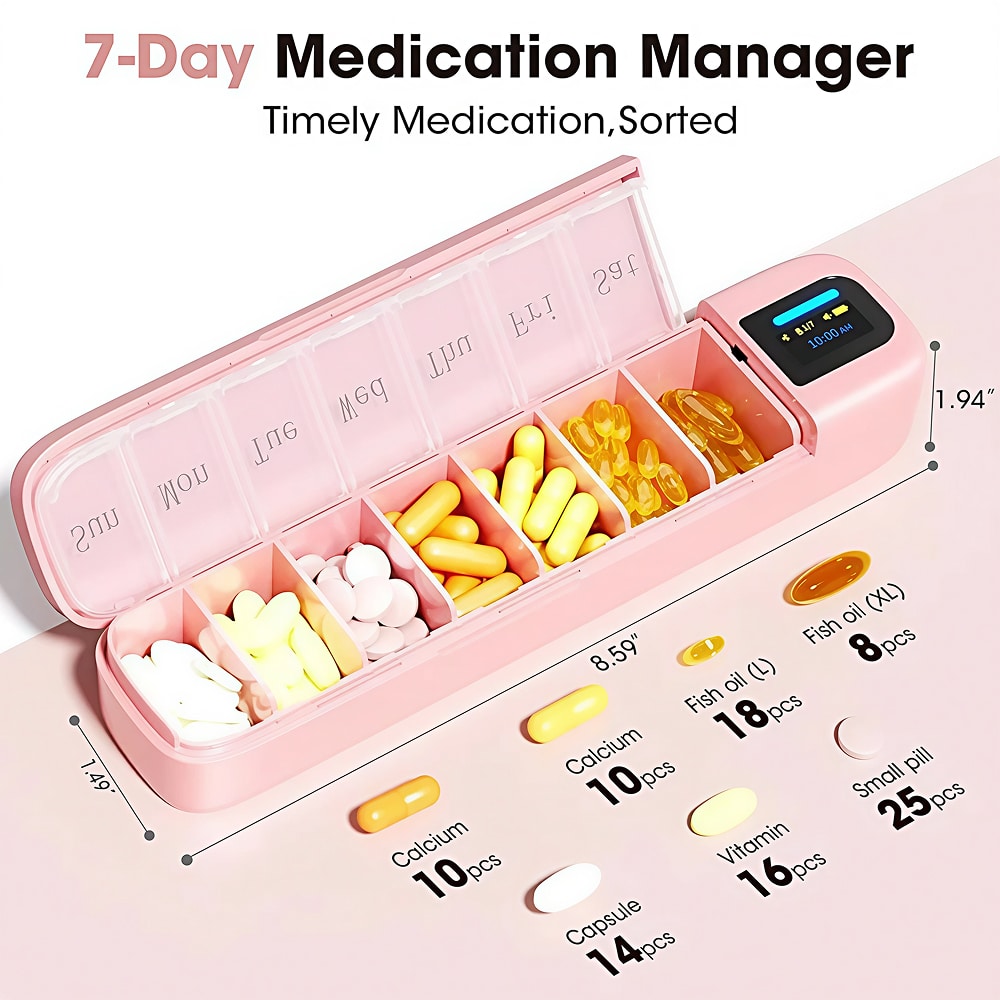 Remove pills before cleaning. Wipe compartments with a slightly damp cloth and mild soap, then dry thoroughly. Avoid submerging the device or getting moisture near the electronic components.
