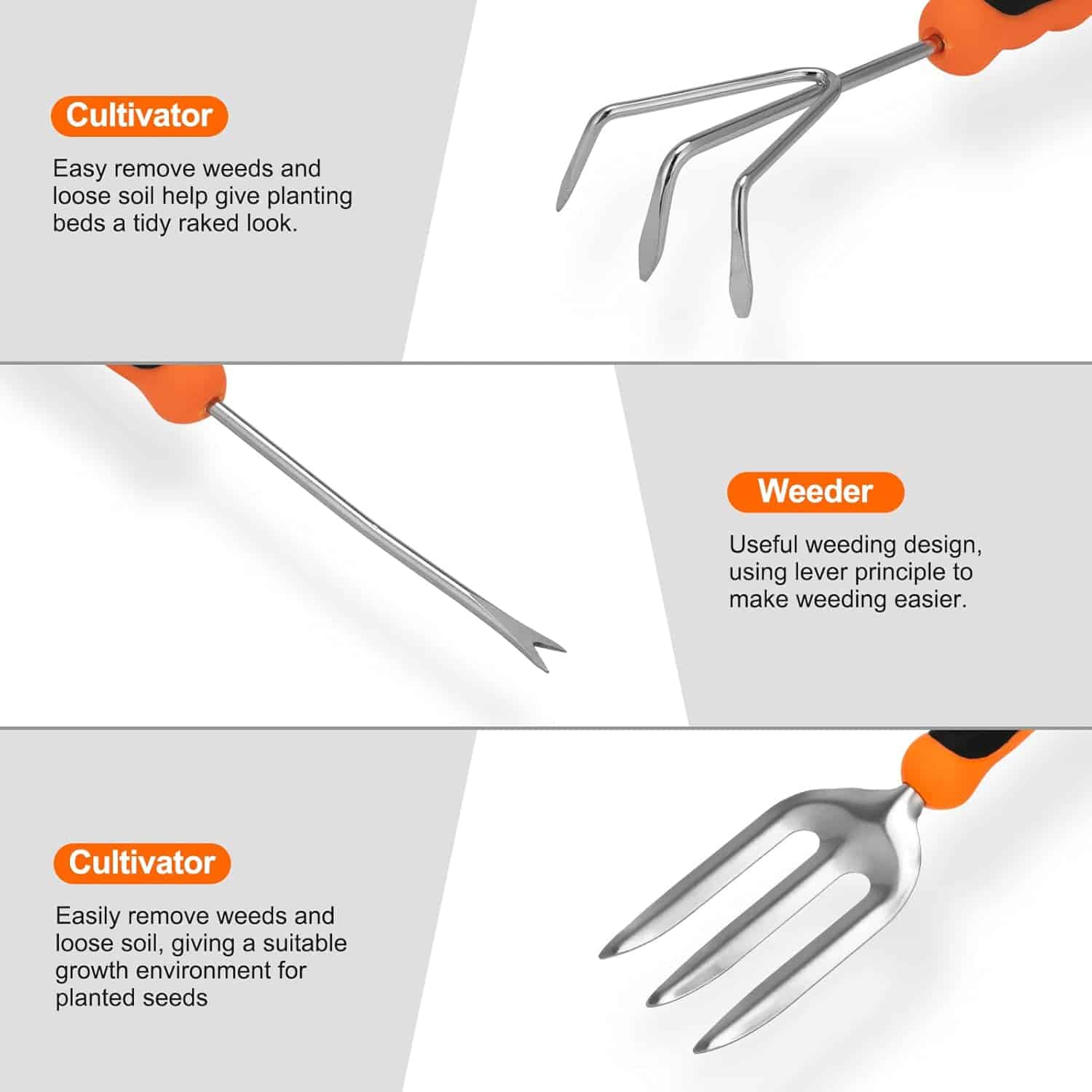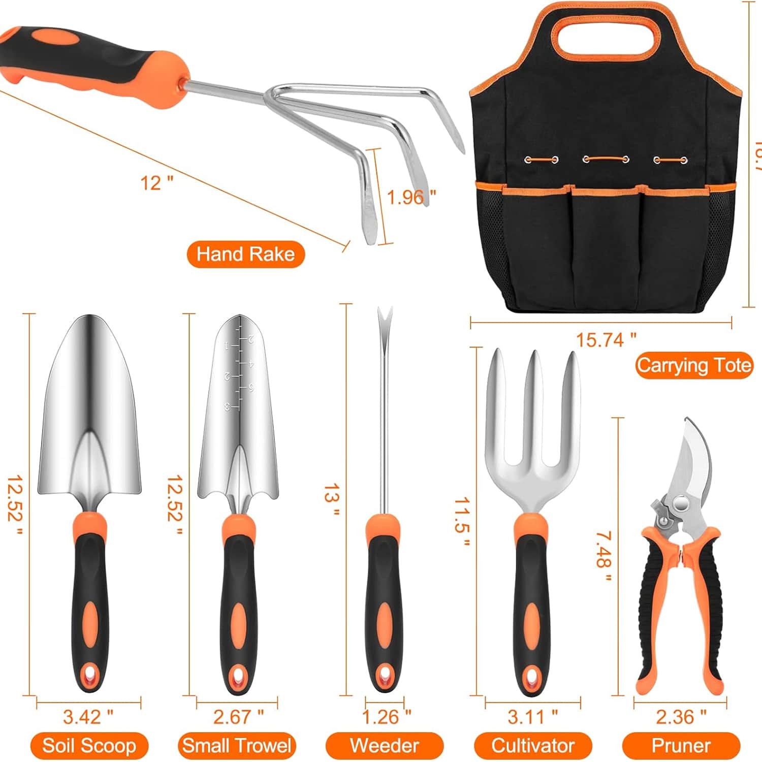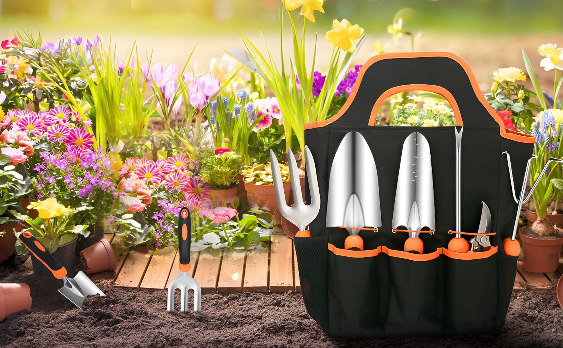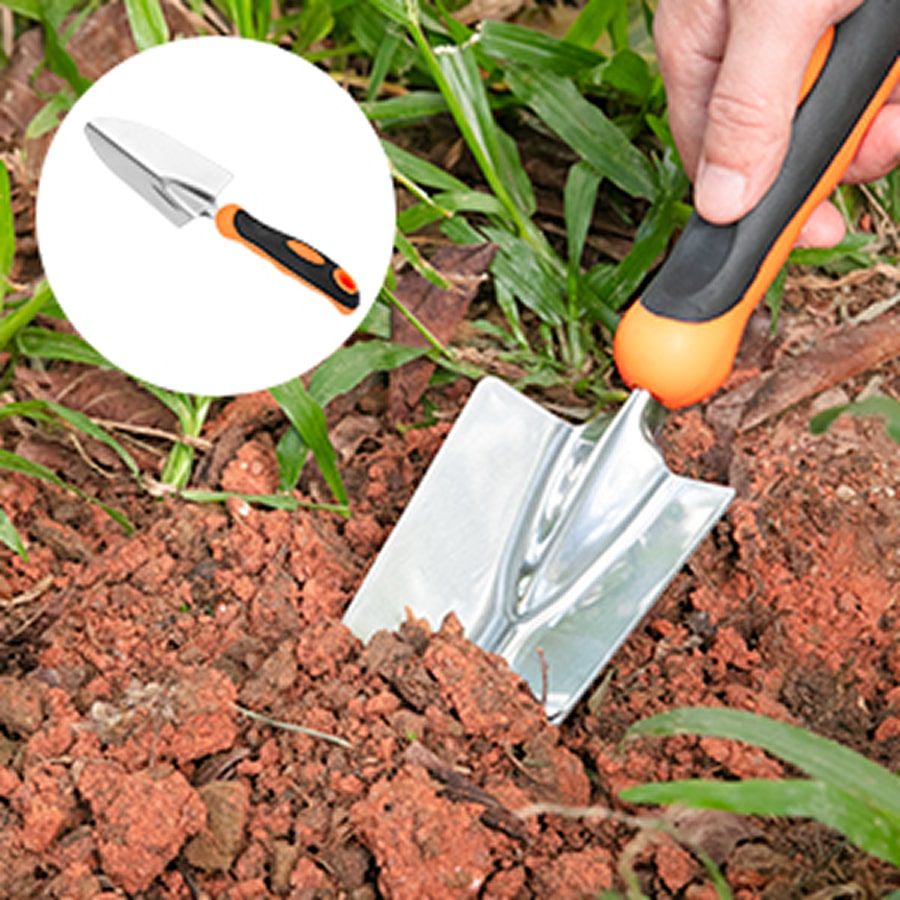 Simply wipe tools with a damp cloth after use and dry thoroughly. For stubborn soil, use mild soap and water. The stainless steel construction resists rust, making maintenance quick and easy.