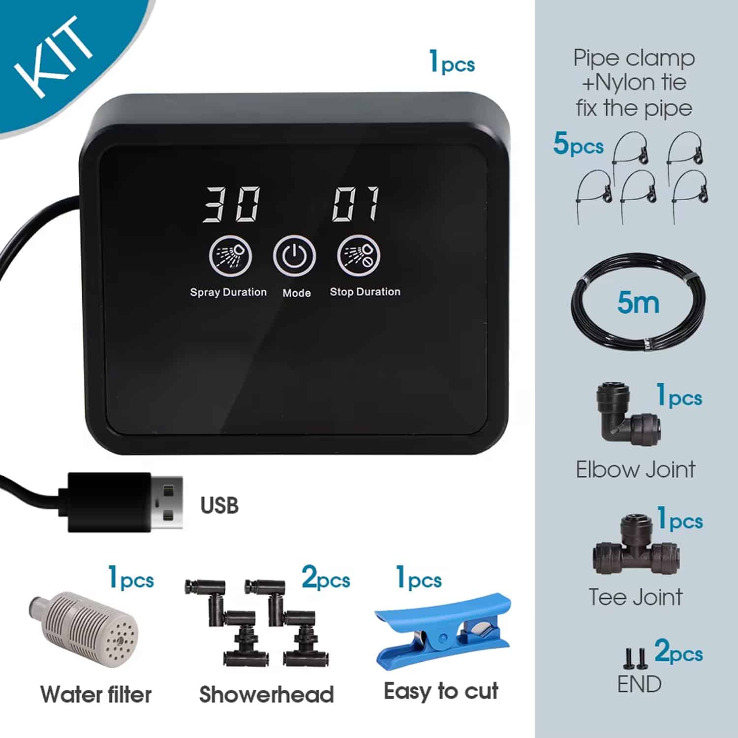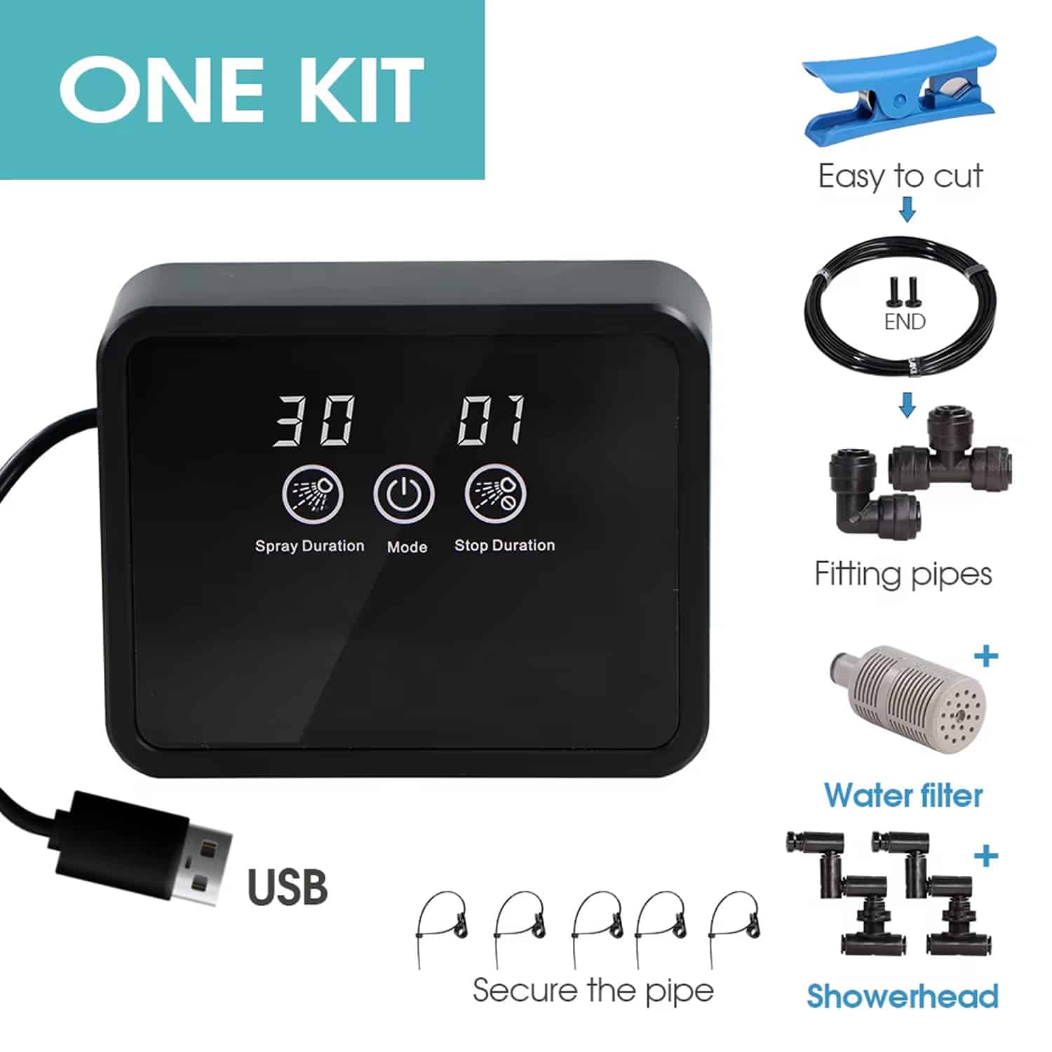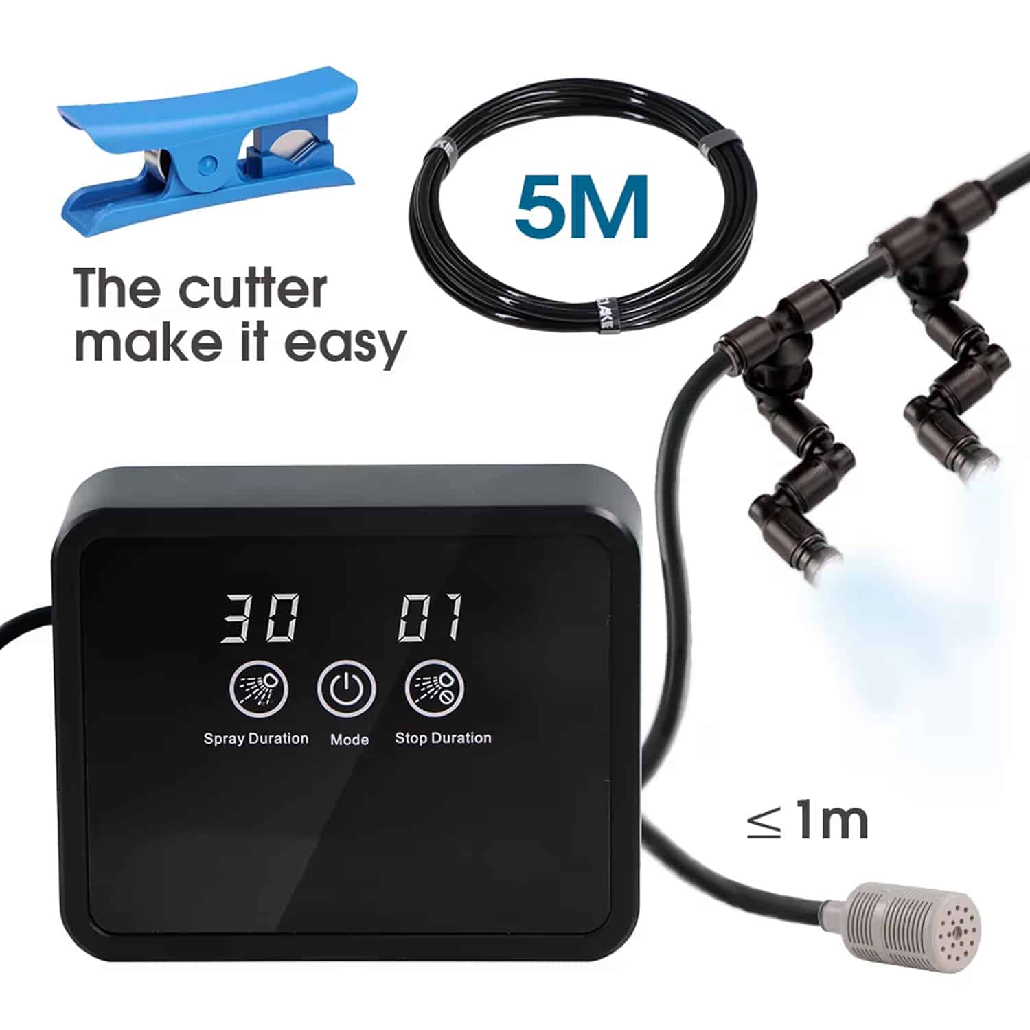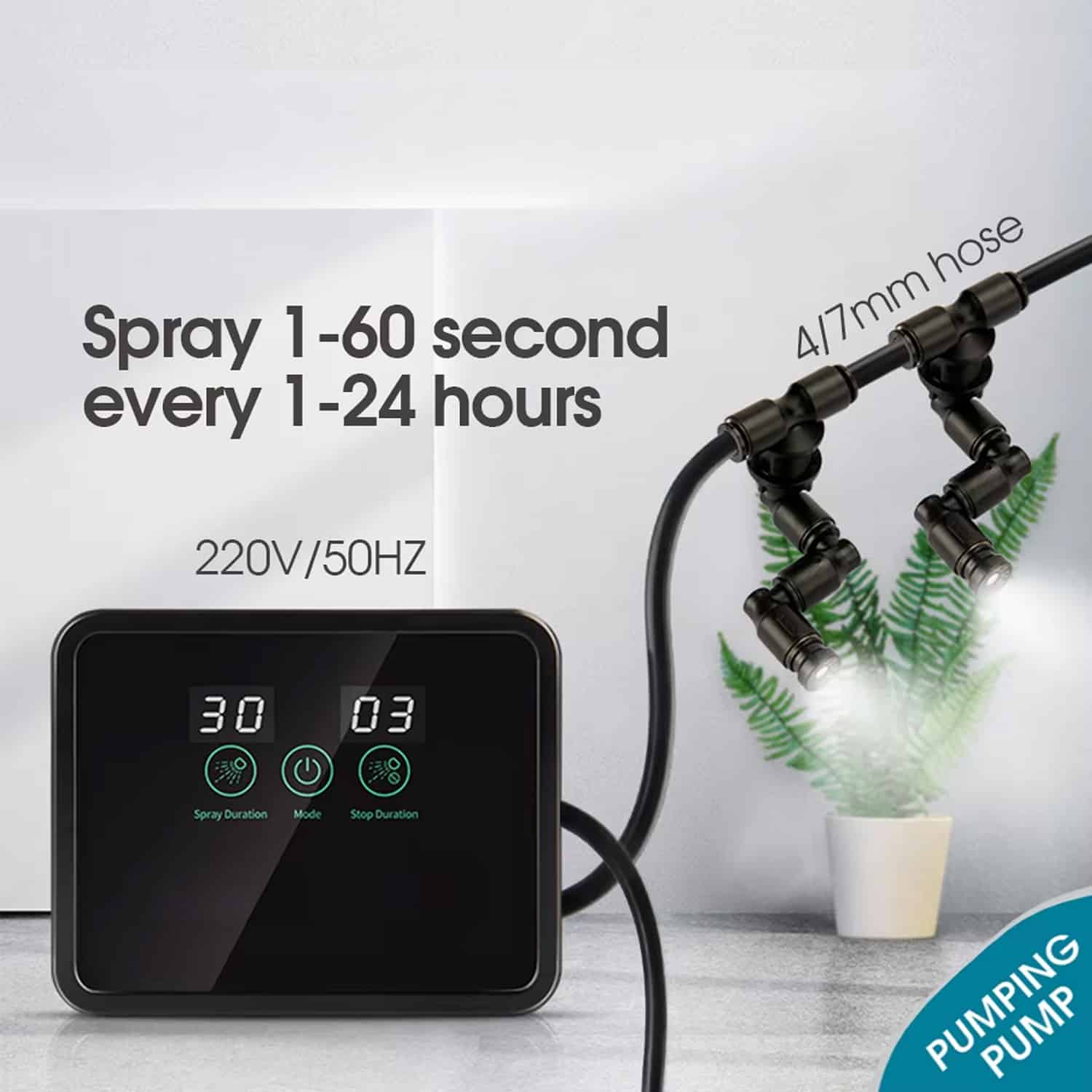 PlantyRix maintains perfect humidity through its programmable digital timer that allows precise control over mist duration and intervals. The system consistently delivers optimal moisture levels automatically, creating ideal environmental conditions for reptile health and comfort without manual intervention.