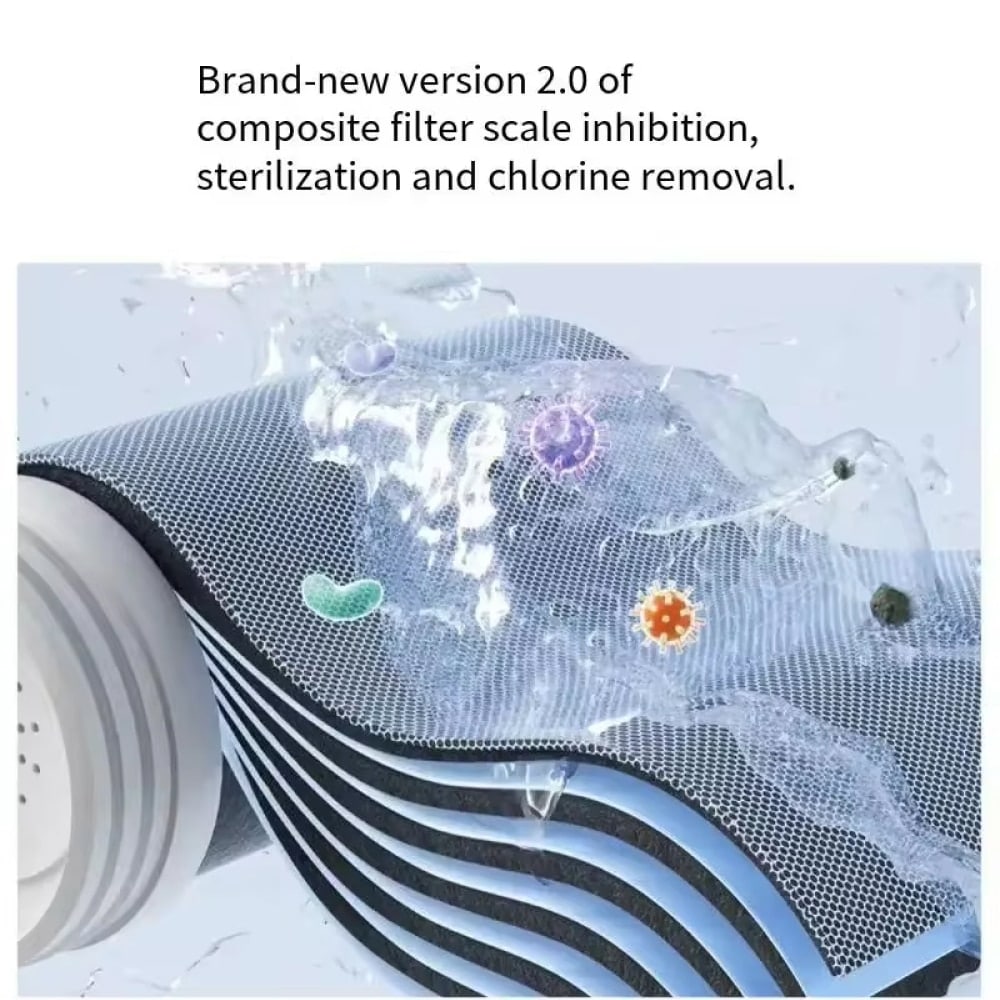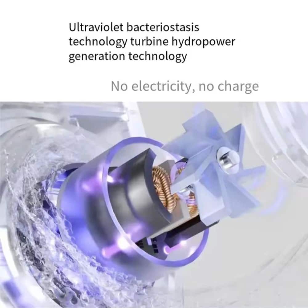 The built-in UV light activates during water flow, exposing water to ultraviolet radiation that destroys 99.9% of bacteria, viruses, and microorganisms without chemicals or affecting taste.
