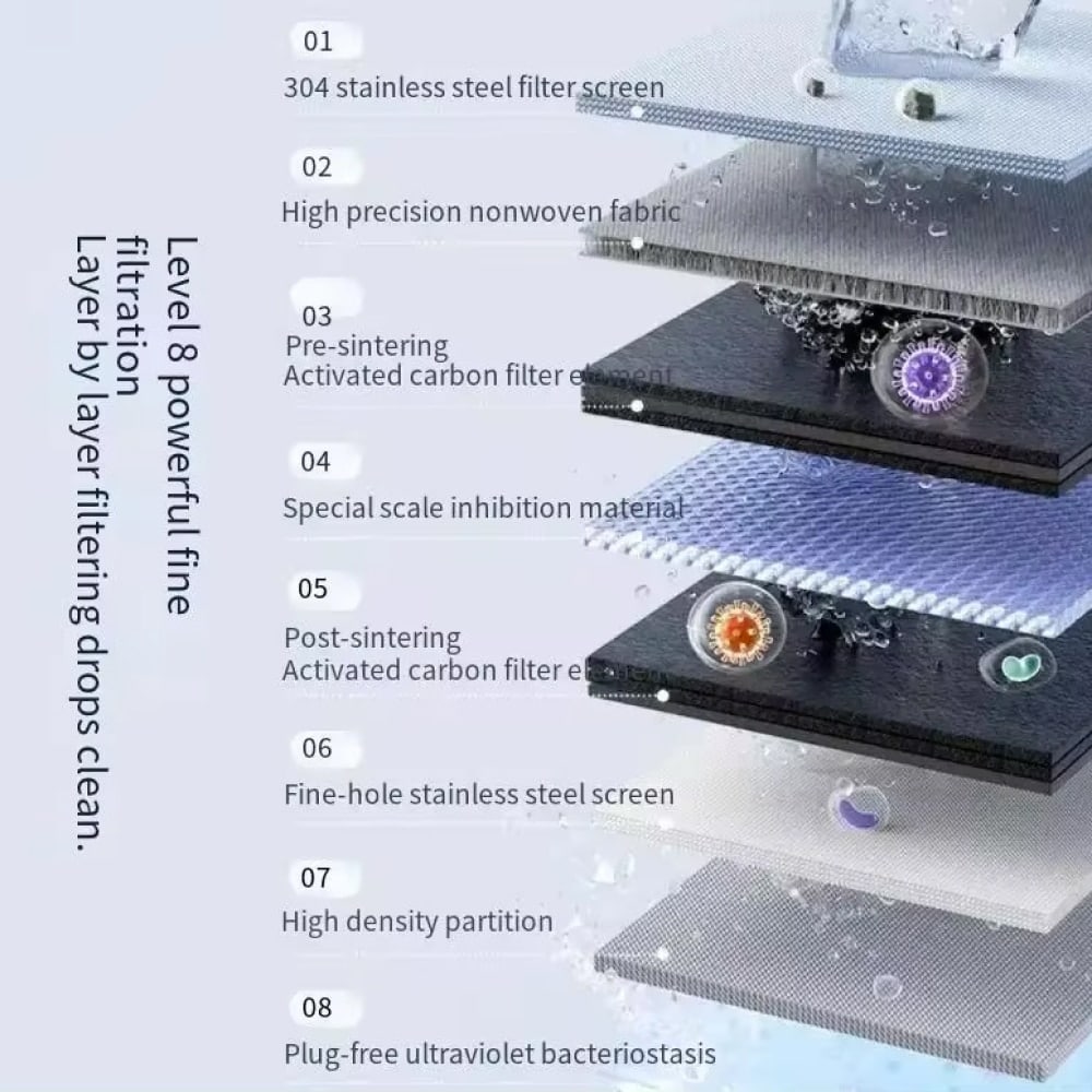 PufixTap removes chlorine, lead, mercury, sediment, rust, pesticides, and other harmful contaminants. The 8-stage process ensures comprehensive purification while preserving beneficial minerals like calcium and magnesium.