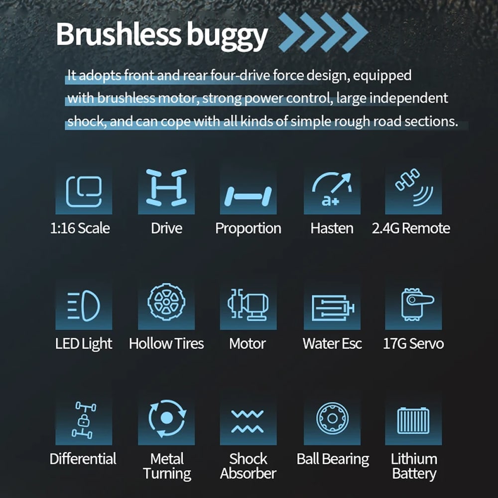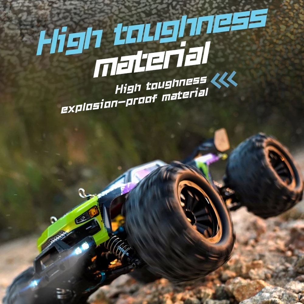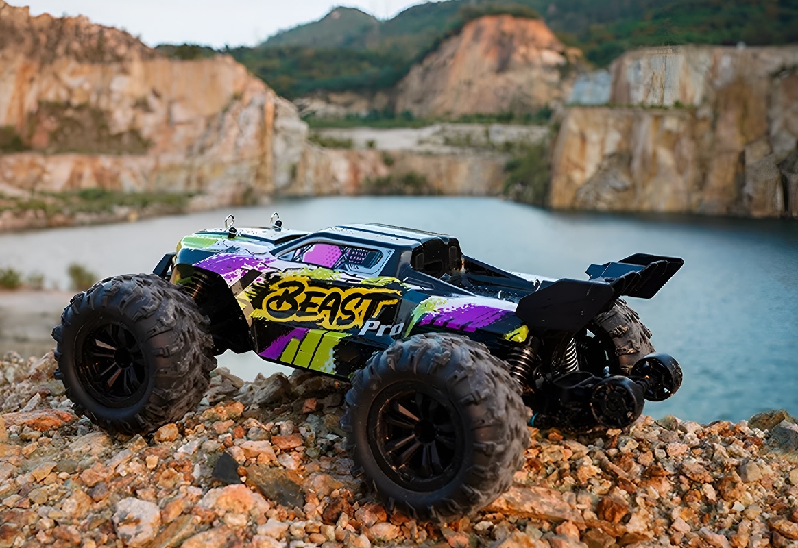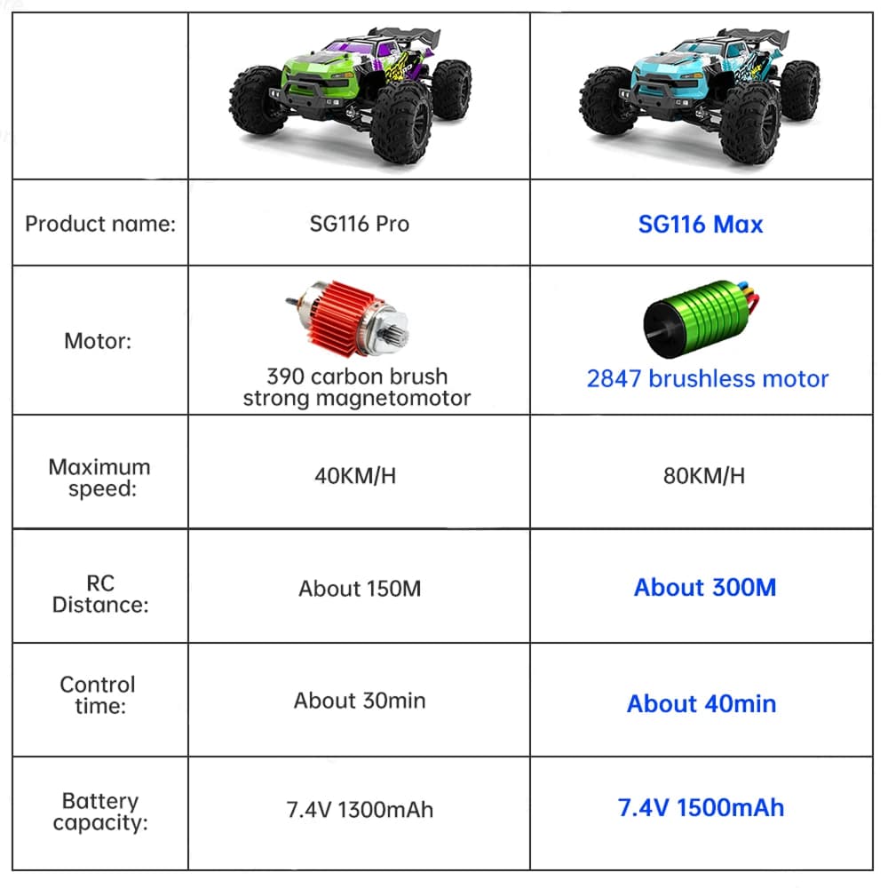The SG116 MAX features a brushless motor reaching 80KM/H, while the SG116 PRO has a brushed motor reaching 40KM/H. Both include 4WD and durable construction, with the PRO model ideal for beginners.