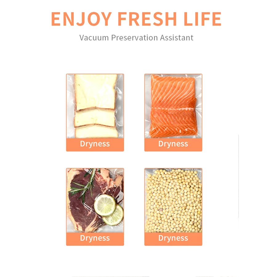 The Sealuxio works with meats, vegetables, fruits, dried goods, and prepared meals. Avoid extremely sharp items that might puncture bags, and freeze liquids before sealing for best results.