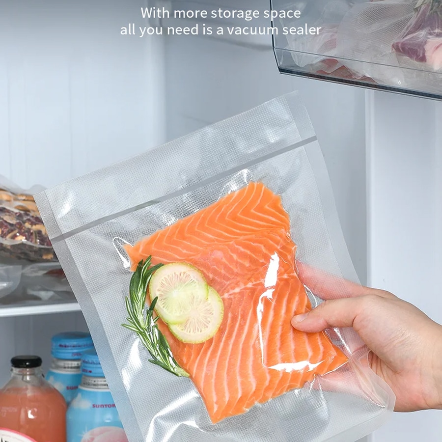 The Sealuxio works with single or double-sided textured vacuum bags. Regular smooth bags require seal-only mode. Avoid using pre-folded bags as they cannot create proper seals.