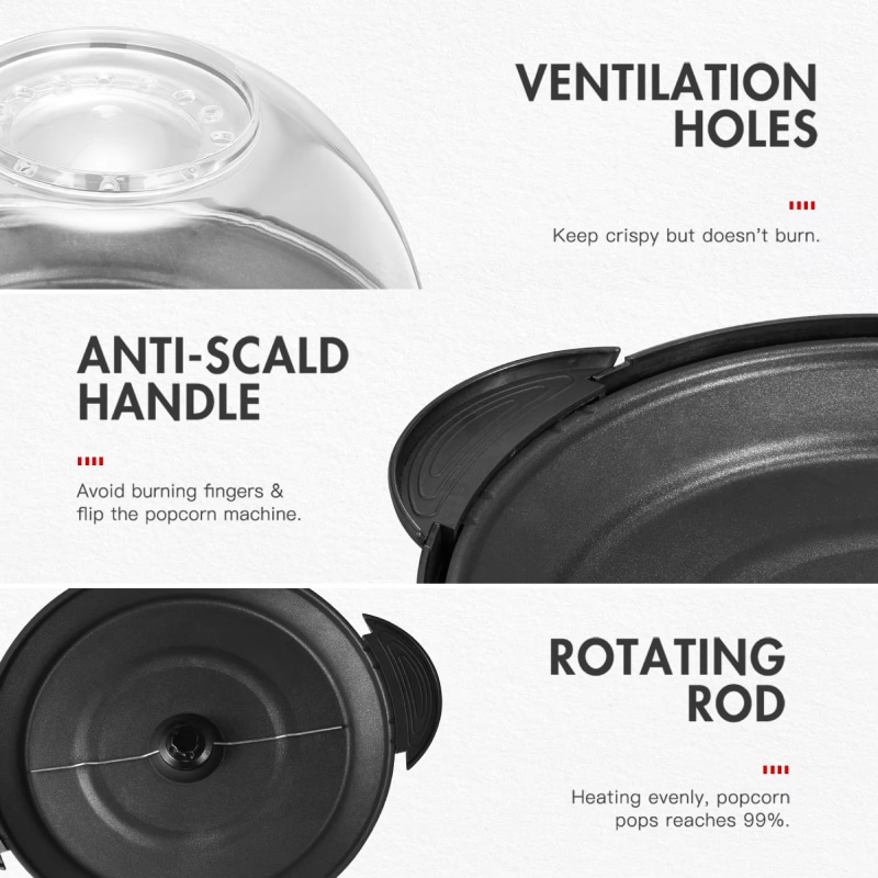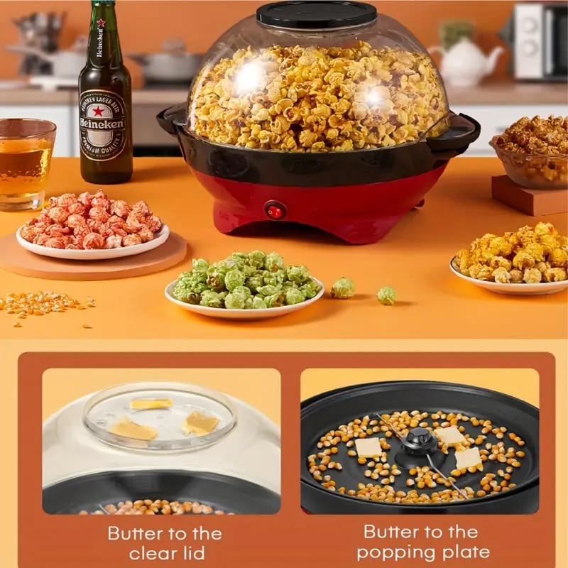 SizeePop's powerful 800W heating system produces a full 6.3-quart batch in approximately 3-4 minutes. The quick-heat technology ensures you're never waiting long for fresh, hot popcorn during movie time.
