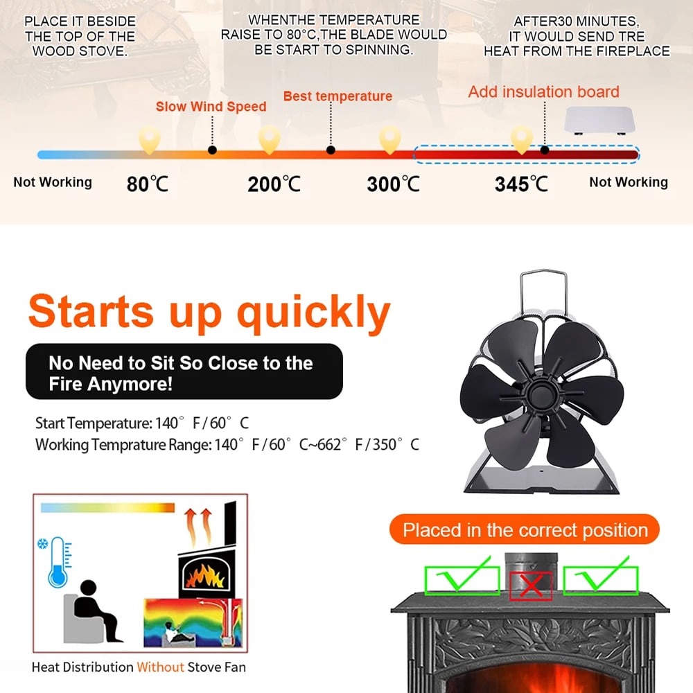 The Stovair Stove Fan solves cold spots by circulating warm air evenly throughout your space. Its powerful 6-blade design moves 160-210 CFM, ensuring every corner receives consistent warmth from your fireplace or wood stove.
