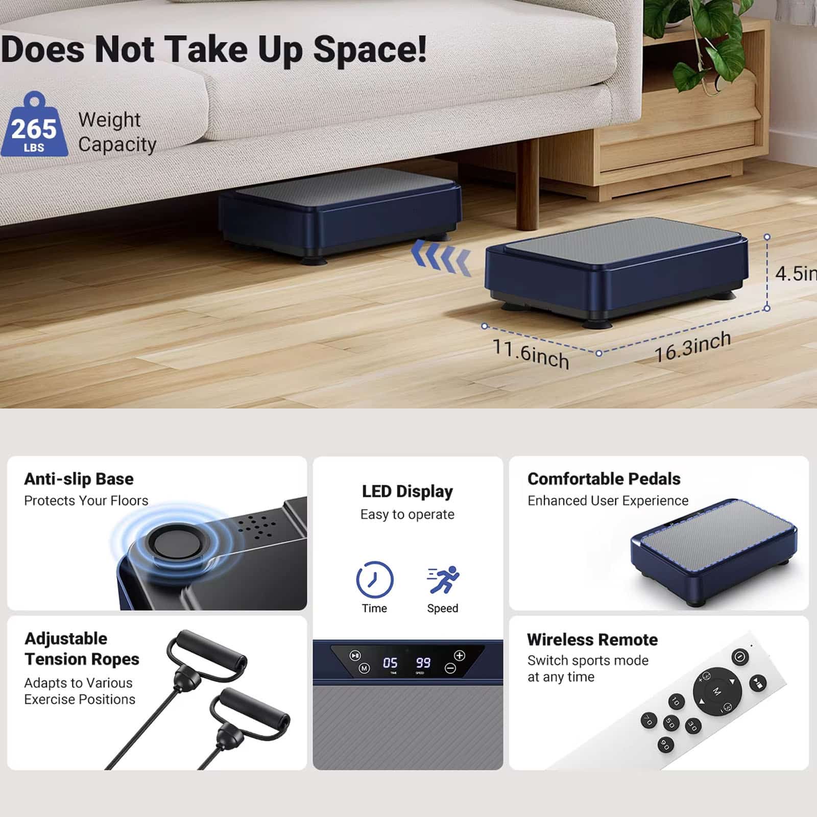 The vibration plate operates almost silently, allowing you to exercise at any time without worrying about disturbing your neighbors or family.