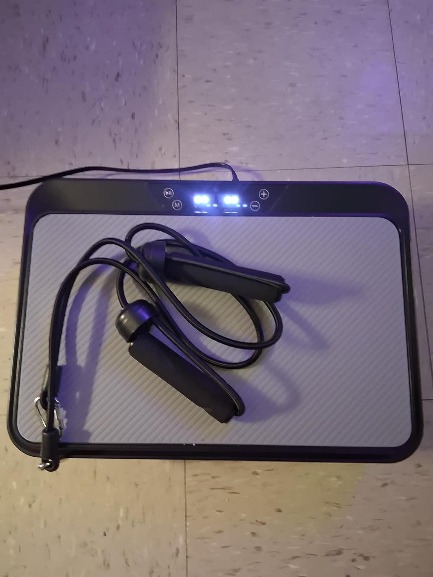 The vibration plate targets legs, muscle areas, foot, hip, core and other body parts with included tension ropes for comprehensive training.